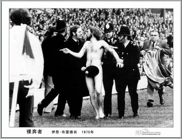 14 在1975年的英国足球联赛上,出现了一位裸奔者,图为一位警察好心的帮他遮住私处