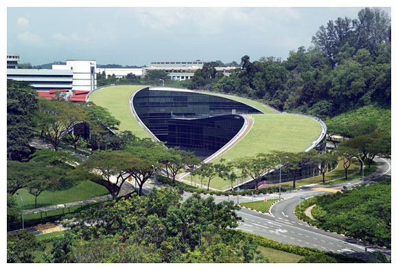 在这所世界一流的大学校园里,小路两旁都栽满了棕榈树和榴莲树,连接着各个现代化的建筑。其中,艺术设计和传媒学院的四层玻璃建筑独具特色,有着开放式的庭院,大楼的屋顶则覆盖有绿草。教室内的设计也走在时代前沿。不同于一般教室常见的白色书写板,在这里取而代之的是交互式屏幕。由于设计独具匠心,再加上对技术的充分利用,使得教室里有组合式的设备、可移动的插座、液晶显示屏和玻璃书写板。