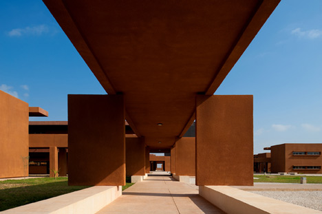 8 塔鲁丹特大学,摩洛哥 这是一座绝对现代化的大学校园。校园的建筑既与该地区的传统风格相呼应,同时又使之现代化。每一面墙都被统一的橘色渲染,共有11面墙,教室、图书馆、报告厅所在的大楼是整个大学内最大的建筑物,它们被中庭、庭院包围。校园里到处是草和摩洛哥特有的阿甘树,远处就是崎岖的阿特拉斯山脉。