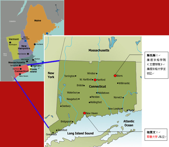 耶鲁(Yale University)坐落于康涅狄格州纽黑文(New Haven),创建于1701年,是美国历史上建立的第三所大学。康涅狄格学院(Connecticut College)主校区坐落于斯托斯(Storrs),是一所私立男女同校的文理学院。