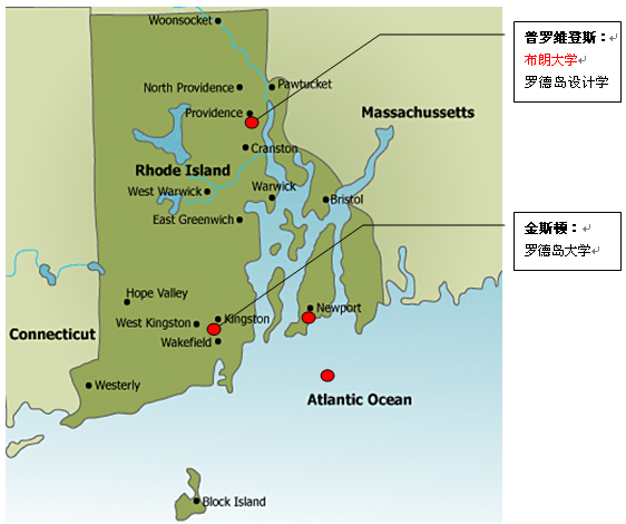 美国布朗大学(Brown University)位于罗德岛州普罗维登斯(Providence),是“常青藤联盟”中的一员,1764年创建之处叫学院。罗德岛大学(University of Rhode Island)位于罗德岛州金斯顿,通常被简称为URI,是一所公立的研究型学院。