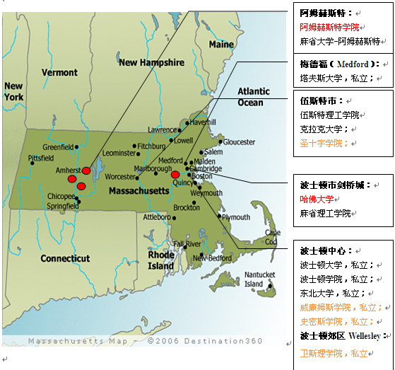马塞诸塞州:麻省林立着众多美国名校,包括坐落于Amherst的阿姆赫斯特学院、麻省大学(阿姆赫斯特),坐落于Medford的塔斯夫大学,坐落于Worcester的伍斯特理工学院、克拉克大学、圣十字学院,坐落于Boston中心的波士顿大学、波士顿学院、东北大学、威廉姆斯学员、史密斯学院,位于Boston Cambridge的哈佛大学、麻省理工学院,位于Boston郊区的卫斯理学院。