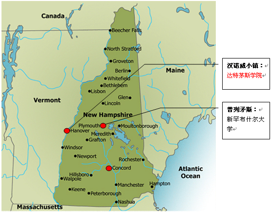 达特茅斯学院(Dartmouth College)坐落于新罕布什尔州汉诺威(Hanover)小镇,成立于1769年,有着悠久的历史,也是常春藤学院之一。新罕布什尔大学(University of Newhampshire)成立于1866年,坐落于普列茅斯(Plymouth)。