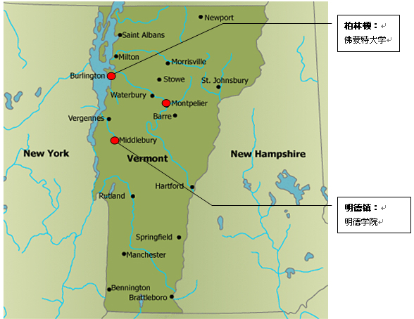 佛蒙特大学(University of Vermont)坐落于佛蒙特州柏林顿(Burlington),建立于1791年,是佛蒙特州最古老的大学院校。明德学院 (Middlebury College) 是全美国顶级的文理学院之一,坐落于佛蒙特州明德镇(Middlebury)。