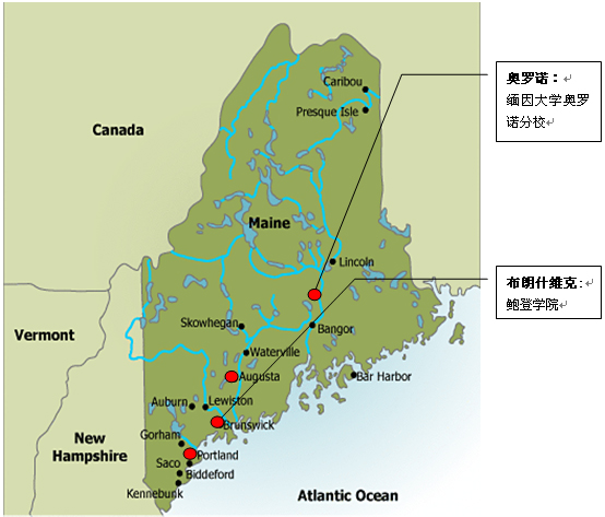 缅因大学奥罗诺分校坐落于缅因州奥罗诺市(Orono),缅因大学是新英格兰地区最大的大学之一,拥有上万名师生。鲍登学院(Bowdoin College)坐落于布朗什维克(Brunswick),以詹姆斯·鲍登的名字命名,从而纪念这位前麻省州长。