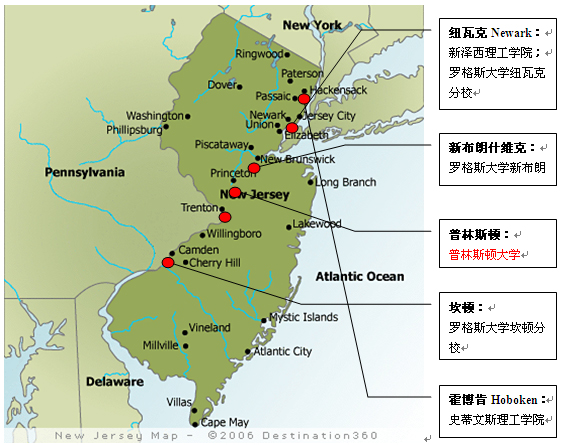 新泽西州也是美国盛产名校的沃土,在这篇土地上新泽西理工学院、罗格斯大学纽瓦克分校位于Newark,罗格斯大学新布朗分校位于New Brunswick,普林斯顿大学位于Princeton,罗格斯大学坎墩分校位于Camden,史蒂文斯理工学院位于Hoboken。