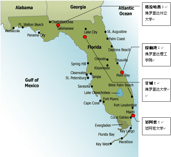 美国佛罗里达州,全美排名第97位的佛罗里达州立大学坐落于Tallahassee,佛罗里达理工学院位于Plam Bay,全美排名第54位的佛罗里达大学坐落于Lake City,全美排名第44位的迈阿密大学当然是坐落于于Miami了。