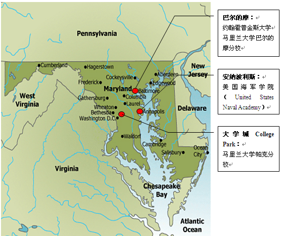 美国马里兰州的巴尔的摩拥有约翰霍普金斯大学和马里兰大学巴尔的摩分校两所全球知名的高等学府,马里兰大学帕克分校坐落于紧邻首都华盛顿特区的大学城,而在安纳波利斯的美国海军学院,美国历史上四位海军五星上将全部来自于此。