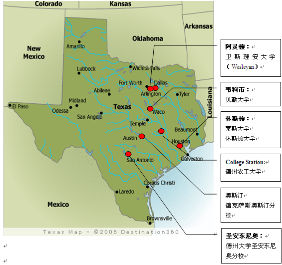 在美国河流众多的德克萨斯州分散着全美数一数二的高等学府,最著名的就是Houston的莱斯大学,此外Arlington有卫斯理安大学,Waco有贝勒大学,College Station有德州农工大学,Austin有德克萨斯奥斯汀分校,San Antonio有德州大学圣安东尼奥分