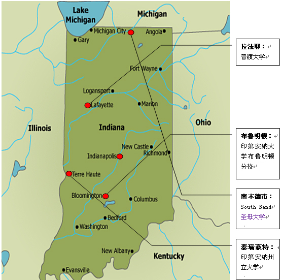 美国印第安纳州,培养出众多诺贝尔奖获得者的普渡大学位于Lafayette,阿巴拉挈亚山脉西部最古老的印第安纳大学布鲁明顿分校位于Bloomington,圣母大学作为一所私立天主教大学位于Michigan City,环境优美的印第安纳州立大学位于Terre Haute。