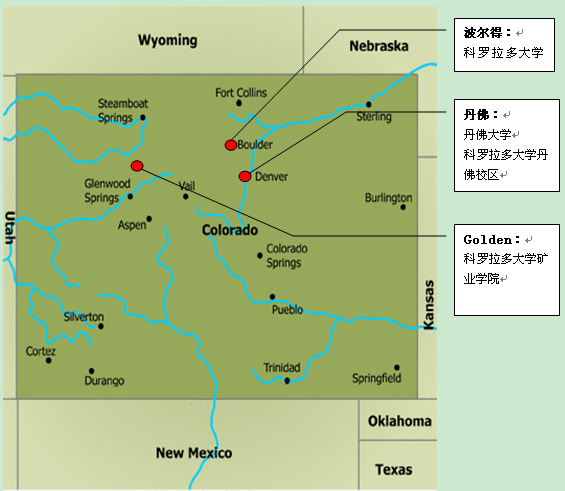 在版图方方正正的科罗拉多州,创建于1876年的科罗拉多大学位于Boulder;洛基山区最老最大的丹佛大学,科罗拉多大学丹佛校区位于Denver;致力于工程及应用科学的科罗拉多大学矿业学院位于Golden。