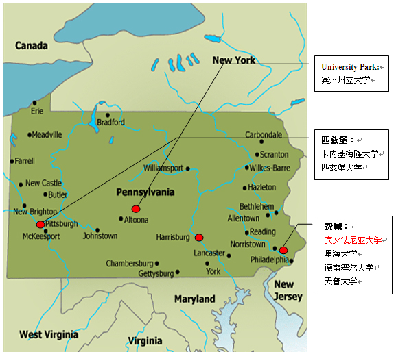 在美国东部与加拿大有接壤的宾夕法尼亚州,宾州州立大学位于Universtiy Park;匹兹堡大学和卡内基梅隆大学位于Pittsburgh;宾夕法尼亚大学、里海大学、德雷赛尔大学、天普大学位于高进新泽西州的Philadelphia。