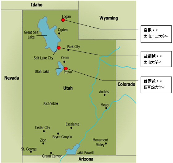 美国犹他州,从北至南,全美工学前100名的犹他州立大学位于Logan,始建于1850年的犹他大学位于全美最佳居住城市Salt Lake City,隶属于摩门教,全美最大的教会大学——杨柏翰大学位于Provo。