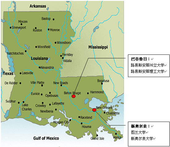 在美国南部、墨西哥湾边上的路易斯安那州,路易斯安那州立大学和路易斯安那理工大学位于密西西比河边的Baton Rouge,新奥尔良大学和图兰大学位于美国第二大港城New Orleans。