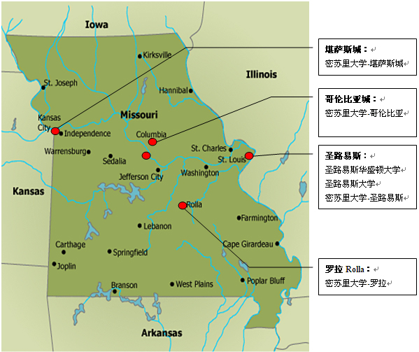 马克·吐温的故乡——美国密苏里州,在Kansas City、Columbia、St.Louis、Rolla四座城市里都有密苏里大学的分校。此外,在St.Louis还有著名的圣路易斯华盛顿大学和圣路易斯大学。