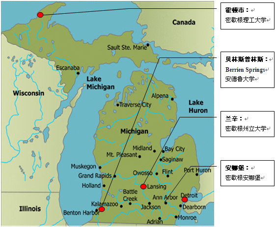 密歇根州,密歇根理工大学位于临近加拿大的霍顿市,收藏有耶稣第7天复活论历史证明的安德鲁大学位于Berrien Springs,密歇根州立大学位于Lansing,密歇根大学安娜堡分校位于Ann Arbor。