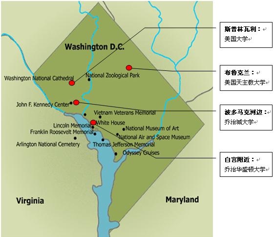 华盛顿哥伦比亚特区位于美国东北部,靠近弗吉尼亚州和马里兰州,这里有百年历史的私立名校——美国大学,美国罗马天主教官方大学——美国天主教大学,首都声誉最高的综合性私立大学——乔治城大学,全美最顶尖私立大学——乔治·华盛顿大学。