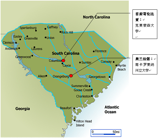 克莱蒙森大学位于首府Columbia,创建于1889年,是一所学费较便宜的公立大学。南卡罗莱纳州立大学位于Orangeburg,是一所历史悠久的黑人大学,也是南卡罗莱纳州唯一一所州立的、历史悠久的、州赠土地的教育机构。