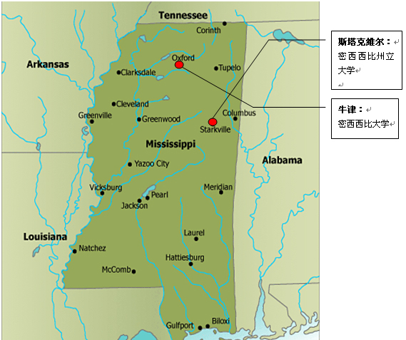 密西西比州立大学位于Starkville,1878年建校,是一所综合性大学,也是密西西比州招生人数最多的大学。密西西比大学主校区位于Oxford,是美国对学生捐赠数额最大的公立院校之一,也是国家投资数额第二大的药科学校。