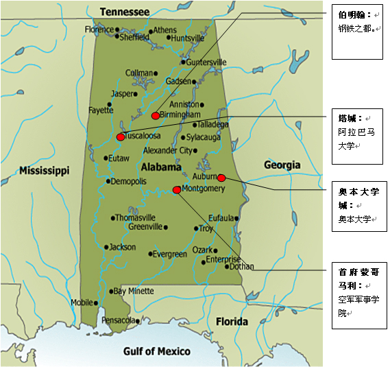 阿拉巴马大学坐落于Tuscaloosa,其橄榄球队Crimson Tide是美国最富盛名的大学橄榄球队。1856年建校的奥本大学坐落于Aubum,拥有阿拉巴马州最大的校园。美国空军军事学院坐落于Montgomery,为美国培养空军指挥军官和高级参谋人员。