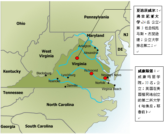 弗吉尼亚大学,全美综合排名第24位,由美国第三任总统托马斯·杰斐逊创建。威廉玛丽学院,全美综合排名第33位,是英国在美国殖民地创立的第二所大学(1693年),晚于哈佛(1636年),早于耶鲁(1701年)。