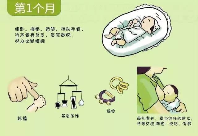 ▼第1个月:俯卧、握拳、蹬腿、挥动手臂、听声音有反应、感官敏锐、视力比较模糊。