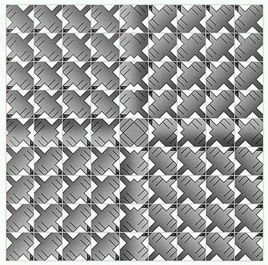 咖啡店幻觉:中心的方块看起来是突出的吗?用直尺检查一下。日本艺术家兼视觉科学家Akiyoshi kitaoka创造这个新幻觉,他称之为咖啡馆幻觉。
