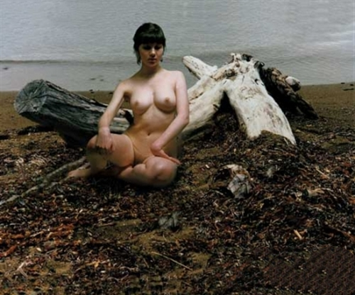 模特梳一个村姑的发式,体形略肥,坐姿略显憨拙。图片选择了灰暗色的河边、枯木为背景,古老、自然、淳朴,充满乡土气息。河边、枯木、健壮的村姑、饱满的乳房,让人联想起人类的繁衍和孕育。