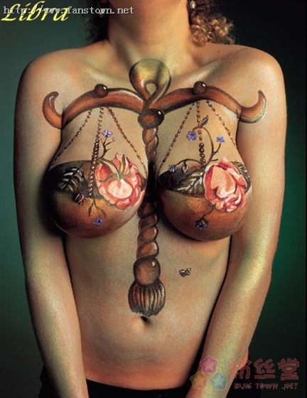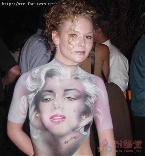 用白色来描绘服饰,在人体彩绘中是比较少见的。模特的两个涂成金色的乳头,恰好构成文化衫中人物的两个金耳钉,构思新奇独特,真可谓是神来之笔。