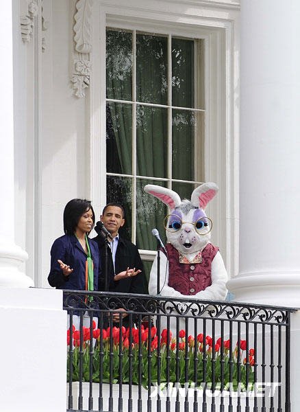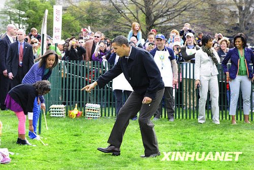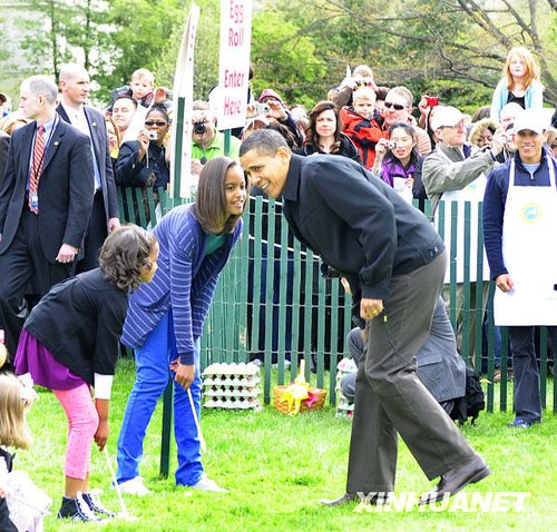 4月13日,美国总统奥巴马在帮助女儿萨莎(左一)和马莉娅(左二)准备滚彩蛋比赛。