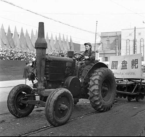 1954年5月1日,天津市农民代表开着拖拉机参加庆“五一”的大游行