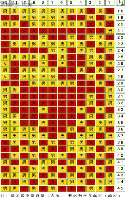 1-12表示怀孕农历月份,18-45是年龄,但要记住,这个表是以虚岁计算的!