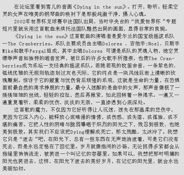 卡百利(小野莓乐队)为数不多舒缓的歌,Dying in the sun是以一个恋人的口气唱出来的,纯爱情歌曲。。。只需闭上眼睛静静聆听。。。聆听爱人的诉说。。。
