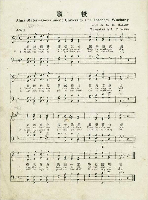 除了美国教会大学之外,民国时期中国的一些国立大学和民办私立大学,也有使用这一旋律填词创作校歌的案例,如上海的私立大夏大学校歌等。而在这其中,最为著名的当属武汉大学的前身——国立武昌高等师范学校校歌了。该校创办于1913年,在1919年五周年校庆前夕,该校创作了校歌。中文歌词为:“乾坤清旷,师儒道光,国学建武昌。镜湖枕麓,屏城襟江,灵秀萃诸方。东西南朔,多士跄跄,教学益相彰。朴诚又勇,陶铸一堂,学盛国斯强。”首句“国学建武昌”,强调了武昌高师是武汉地区历史上的第一所国立高等学校;次句“镜湖枕麓,屏城襟江”,则勾画出了高师背靠蛇山,前临长湖,雄立长江之滨武昌城内的校园景观;第三句“东西南朔,多士跄跄”,描绘了校园内名师云集,学子济济的儒雅气象;末句则以校训“朴诚勇”作结,对广大学子提出了努力学习,报效国家的美好期望。虽然这首校歌歌词的作者已不可考,但歌词古朴文雅,言简意赅,突出了武昌高师的校园文化特色,堪称一首成功的经典大学校歌。