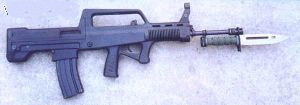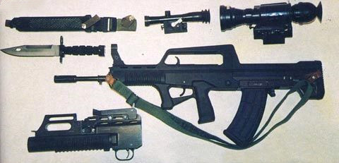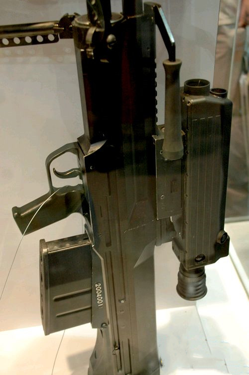 (7)一枪多能、一族多枪。该族步枪下挂35毫米榴弹发射器,亦可从枪口用枪弹发射枪榴弹,扩大了点面杀伤能力。有多功能刺刀及刀鞘,携带方便,具有刺杀、砍、剪、锯、削的功能,还可当匕首使用,扩大了步枪的战术作用。新枪族除步枪、机枪外,还有短步枪(全枪长560毫米,全枪重2.8千克)、折叠枪托步枪,实现了一族多枪,可满足各兵种人员的需要。