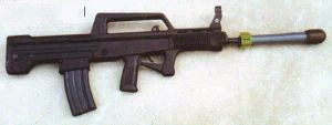 QBZ97式自动步枪(1999年刚公布图片时曾被称为99式,在2000年的刊物上正式称为97式)是QBZ95式自动步枪的出口型,口径为西方国家流行的5.56mm NATO,主要是发射SS109规格的步枪弹。QBZ97整枪特点与QBZ95式基本相同,在外观上最明显的区别是两枪的机匣外形和弹匣。97式在供弹具的位置上有一个向下凸出的接口,而95式比较平坦;97式的供弹具是直插装卸、侧面卡制的“直弯直”型铝合金弹匣,即M16标准的弹匣,而95式采用前后卡制、转动装卸的“全弯”型塑料弹匣。