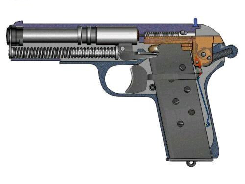 由于5.8mm手枪弹的膛压和初速都比较高,要使枪机质量轻而且后坐速度不能太大,保证射击时平稳、舒适,必须采用合理的开闭锁机构。5.8mm手枪采用了惯性闭锁,枪管回转半自由枪机式自动方式。枪机后坐2mm自由行程后,枪机迫使枪管回转,消耗枪机后坐能量,降低后坐速度,减轻后坐撞击,因而射击时握持舒适,不震手,并可提高射击精度。