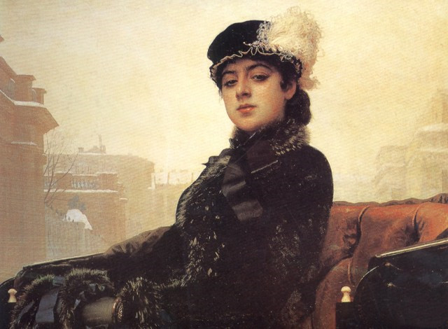 3、无名女郎 1883年 I.N.克拉姆斯柯依 俄国 75.5cm×99cm 布 油彩 莫斯科 特列恰科夫美术馆藏 这是一幅颇具美学价值的性格肖像画,画家以精湛的技艺表现出对象的精神气质。画中的无名女郎高傲而又自尊,她穿戴着俄国上流社会豪华的服饰,坐在华贵的敞蓬马车上,背景是圣彼得堡著名的亚历山大剧院。究竟“无名女郎”是谁,至今仍是个谜。画家在肖像画上创造了一种新的表现风格,即用主题性的情节来描绘肖像,展示出一个刚毅、果断、满怀思绪、散发着青春活力的俄国知识女性形象。