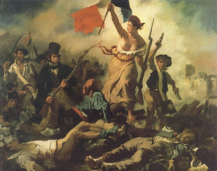 11、自由引导人民 德拉克罗瓦 法国 1830年 油画 260×325厘米 卢佛尔博物馆 反映1830年革命的《自由引导人民》是德拉克罗瓦最具有浪漫主义色彩的作品之一。画家以奔放的热情歌颂了这次工人、小资产阶级和知识分子参加的革命运动。高举三色旗的象征自由神的妇女形象在这里突出地体现了浪漫主义特征。她健康、有力、坚决、美丽而朴素,正领导着工人、知识分子的革命队伍奋勇前进。强烈的光影所形成的戏剧性效果,与丰富而炽烈的色彩和充满着动力的构图形成了一种强烈、紧张、激昂的气氛,使得这幅画具有生动活跃的激动人心的力量。 本画取材于1830年法国的七月革命事件。1830年7月26日,国王查理十世取消议会,巴黎市民纷纷起义。27至29日为推翻波旁王朝,与保皇党展开了战斗,并占领了王宫,在历史上称为"光荣的三天"。在这次战斗中,一位名叫克拉拉·莱辛的姑娘首先在街垒上举起了象征法兰西共和制的三色旗;少年阿莱尔把这面旗帜插到巴黎圣母院旁的一座桥头时,中弹倒下。画家德拉克洛瓦目击了这一悲壮激烈的景象,又义愤填膺,决心为之画一幅画作为永久的纪念。 画上展示的巷战场面,是画家在上百幅"七月革命"街垒战的草图的基础上定稿的画面。最引人注意的一位象征自由的女神,她头戴法国大革命时期的红色弗吉里亚帽、左手握枪、右手高举着迎风飘扬的三色旗。她是全画的中心,观众注目的焦点。女神的左侧,一个少年挥动双枪急奔而来,他象征着少年英雄阿莱尔;右侧那个穿黑上衣、戴高筒帽的大学生,就是画家本人,他紧握步枪,眼中闪烁着自由的渴望。 这幅画气势磅礴,画面结构紧凑,色调丰富炽热,用笔奔放,有着强烈的感染力。1831年5月1日,在巴黎展出时,引起轰动。德国诗人海涅为此画写了赞美诗。在这以后,这幅画还有一些有趣的经历。1831年,这幅画被法国政府收购,在卢森堡宫展出了数月,后因时局变化,还给了画家本人。17年后,1848 年法国爆发了二月革命,法国人民要求把此画重新在卢森堡宫展览。同年6月,巴黎工人起义,此画又被政府摘下,理由是具有煽动性。直到1874年才被送入卢浮宫。