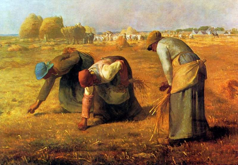 12、拾穗 弗朗索瓦.米勒 法国 油画,83.5×111厘米,1857年, 巴黎卢浮宫藏 《拾穗》是米勒最重要的代表作,这是一幅十分真实的,亲切美丽,而又给人以丰富联想的农村劳动生活的图画。从中不难看出画家对劳动的甘苦,特别是“汗滴禾下土,粒粒皆辛苦”的意义是有着切身的深刻体验的。整个作品的手法极为简洁朴实,晴朗的天空和金黄色的麦地显得十分和谐,丰富的色彩统一于柔和的调子之中,它像米勒的其它代表作一样,虽然所画的内容通俗易懂,简明单纯,但又绝不是平庸浅薄,一览无余,而是寓意深长,发人深思,这是米勒艺术的重要特色。米勒是十九世纪法国现实主义在师,他的大量的以农民题材为主的油画、素描、版画至今仍给我们深刻的启示与鼓舞。 《拾穗》描写了一个农村中最普通的情景:秋天,金黄色的田野看上去一望无际,麦收后的土地上,有三个农妇正弯着身子十分细心地拾取遗落的麦穗,以补充家中的食物。她们身后那堆得像小山似的麦垛,似乎和她们毫不相关。我们虽然看不清这三个农妇的相貌及脸部的表情,但米勒却将她们的身姿描绘有古典雕刻一般庄重的美。三个农妇的动作,略有角度的不同,又有动作连环的美,好像是一个农妇拾穗动作分解图。扎红色头巾的农妇正快速的拾着,另一只手握着麦穗的袋子里那一大束,看得出她已经捡了一会了,袋子里小有收获;扎兰头巾的妇女已经被不断重复的一上一下弯腰动作累坏了,她显得疲惫不堪,将左手撑在腰后,来支撑身体的力量;画右边的妇女,侧脸半弯着腰,手里捏着一束麦子,正仔细巡视那那已经拾过一遍的麦地,看是否有漏捡的麦穗。农妇们就是如此往复地劳动着,为了全家的温饱,怀着对每粒粮食的感情,耐心而不辞辛苦地拾着麦穗。 画面上,米勒使用了迷人的暖黄色调,红、蓝二块头巾那种沉稳的浓郁色彩也融化在黄色中,整个画面安静而又庄重,牧歌式地传达了米勒对农民艰难生活的深刻同情,和米勒对农村生活的特别的挚爱。。