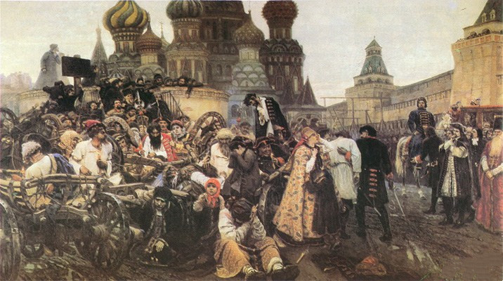 14、近卫军临刑的早晨 (俄)苏里柯夫 油画 1881年 218×375cm 藏于特列恰可夫画廊 《近卫军临刑的早晨》描写了17世纪俄国历史上的一件真事。1698年正当彼得大帝出国访问时,俄国发生了近卫军兵变。彼得大帝得知后仓促回国,立即残酷地镇压了这次兵变。画面的背景是莫斯科克里姆林宫的墙外和华西里伯拉仁诺大教堂的天球顶。身穿海蓝色军装的彼得大帝骑在高头大马上,亲自监督处决“谋反” 的近卫军。他的背后是整齐森严的行刑队和一排绞刑架,他的右边是一群外国使节和他的宠臣。占据画面大部分前景的是动乱的人群,一些农民装束的近卫军家属围绕在六个即将临刑的近卫军身旁,他们悲痛地哭泣着。表现了宁死不屈的俄罗斯民族的坚强性格。苏里柯夫(1848-1916)善于创作大型历史画,《近卫军临刑的早晨》、《缅希柯夫在别留佐夫镇》、《女贵族莫洛卓娃》被称为苏里柯夫历史画的“三部曲”。