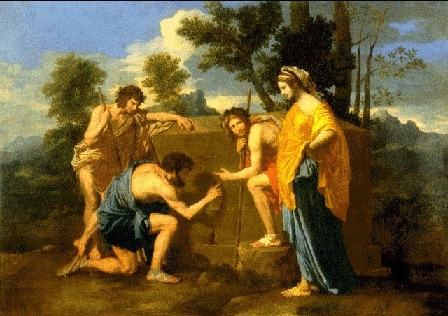 15、阿尔卡迪的牧人 尼古拉·普桑 法国 尼古拉.普桑(Nicolas Poussin)被认为是十七世纪法国最杰出的巴罗克(Baroque)大师。《阿尔卡迪的牧人》为其代表作。在这幅画里,三男一女四位牧人正在辨认墓碑上的拉丁文:“Et in Arcadia ego”,不管ego是否死亡本身,整个画面表现的确实是对“死亡”的讨论和思索。天色有点暗,有三棵远近不一的树都倾向左边,石墓线条端庄,四个人神态各异。画面的右后方,在较暗的地方透出晚霞,这几缕光线使整个画面显得特别优美,这种对幽暗的平衡,使人丝毫感觉不到死亡的可怕。的确,使我们害怕的不是死亡本身,而是它所代表的“分离”(至于说对“无意识”的恐慌,是荒唐可笑的,因为既是“无意识”,也就不会感觉到失望或痛苦的可能。)“分离”是我和别人的,甚至是我和自己的。但这种分离不独死亡才具有。死亡只不过表示分离的不可逆转,而其他类型的(“生的”)分离还可以给人一个幻想的机会。幻想的可能性在于其本人的想象力和创造力。