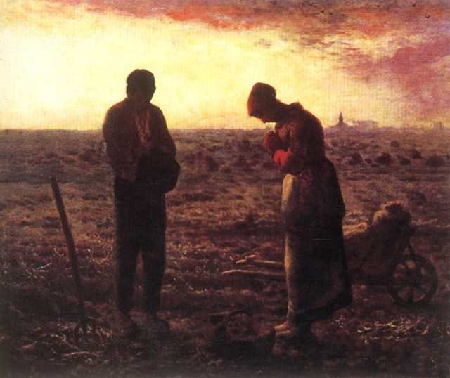 16、晚钟 米勒 1850年 55.5×66厘米 巴黎卢浮宫藏 看到这对在田间默默祈祷的农民夫妇,我们仿佛也听到了远方依稀可见的教堂传来的钟声:这“钟声”好象越来越大,传得越来越远…… 也许是这对伫立在农田里剪影一般的农夫与地平线交叉的形式使人联想到了庄严、神圣的“十字架”,从而,拉近了农夫、教堂与观赏者的距离并强化了教堂钟楼的“音响”感应;也许是由于日暮余辉的笼罩、屏息静思的农夫和静穆沉寂的大地的反衬;也许是由于画家刻意把人物、景物恰如其分地虚化,不但人物、景物、教堂以及教堂里传出的“钟声”可以融为一体,好象观赏者为画中人、画中景、教堂及教堂钟楼里传出的钟声也融成了一体…… 这浓郁强烈的宗教情感,这凝重圣洁的宗教气氛,这庄严、肃穆、令人敬畏的宿命色彩和安贫乐道的基督徒形象,这深沉、悠远、悲壮的诗意境界,这直指人心的精神魔力;如果不是一个虔诚的基督教徒,没有在宗教境界修炼到一定程度,没有深厚的文学艺术修养,没有巨大的精神投入和高超出众的绘画技艺,是很难创作出这样的杰作的。 这外在粗陋、朴实,甚至木纳、痴呆,而内心纯净虔诚、温顺善良的农民形象,不仅体现了米勒对农民的深深理解和深厚的感情,也体现了19世纪后半叶艺术家强烈的民主意识以及现实主义的求实精神。