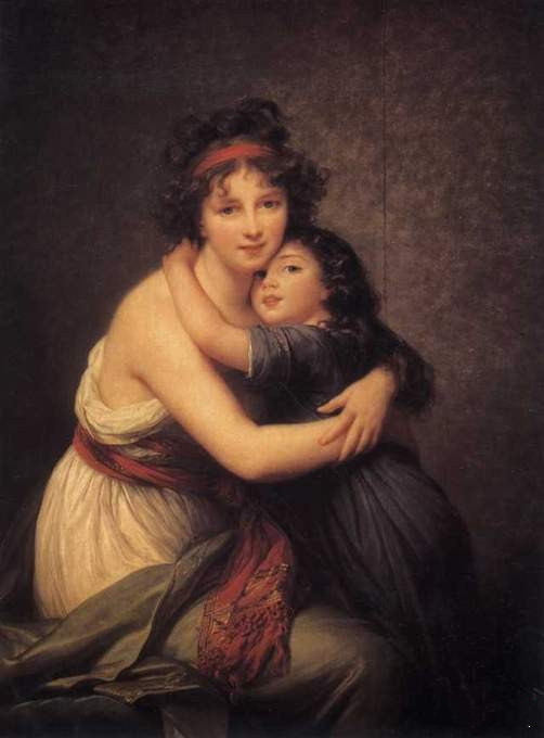 17、画家与女儿像 1789年 伊丽莎白·路易丝·维瑞 法国 布上油画 130×94CM 巴黎卢浮宫藏 《画家和她的女儿》是作者最出色的代表作,也是她的自我写照。上述肖像画的特点在这幅作品中都得到了充分的体现。这是她32岁时所作,十分潇洒优雅。女画家装束朴素典雅,端庄秀丽,目光温柔而深情。她俯身坐着,双臂围抱着女儿的脸。女儿天真可爱,把脸紧贴母亲,搂着妈妈的脖子,显得无限妩媚。作品将母女之爱、亲子之情画得十分动人,也表现了画家自己的温婉多情。构图采用了稳定匀称的三角形,色彩雅致和谐,线条优美洗练,背景不加任何陪衬,更突出了主题。