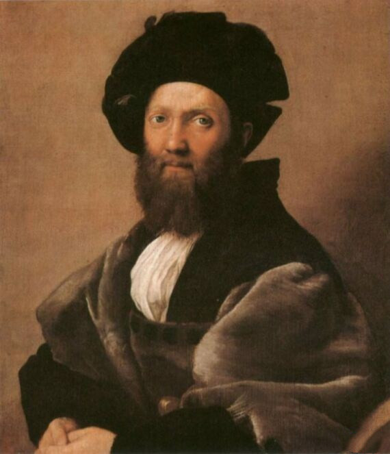 19、巴尔达萨雷·卡斯蒂利奥奈 拉斐尔 意大利 布面油画 82*66cm 1516年作 现藏于巴黎卢浮宫 拉斐尔的《巴尔达萨雷·卡斯蒂利奥奈》这幅作品真切而生动地反映了这位政治家、外交家兼学者于一身的形象特征:他那黑亮、锋利而又平和的眼神,好象能够看穿一切;他那微红、紧闭、外柔内刚的双唇,显示了他自信、果断、严谨和善辩的机巧;微微翘起的下巴,那浓密、整齐的络腮胡须,显示了意大利16世纪文艺复兴时期学者特有的风范;那黑色的礼帽,白色的衬衫,灰黑色的素装又反映了被画者在当时主张摒弃艳装提倡素装的时代风尚。如果用拉斐尔的这幅肖像画与前两期我们看到的作品比较一下,就会发现:他的画既没有达·芬奇画中那朦胧、神秘的晦涩;也没有米开朗基罗雕刻中那紧张、沉重的悲剧意识。他的画单纯、明快、温煦、甜美,与前者相比显得更亲切、更平和、更能接近一般欣赏者的审美口味