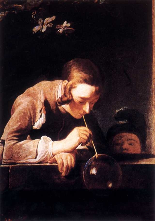 20、吹肥皂泡的少年 夏尔丹 油画 1730年 88×70厘米 藏华盛顿国立美术馆 《吹肥皂泡的少年》是夏尔丹早年的一幅风俗画:一个衣着破旧但不失为整洁的少年正在从室内向室外吹着肥皂泡,他聚精会神小心翼翼地将肥皂泡越吹越大,越吹越大……还有一个孩子,看上去仅有3、4岁,正踮着脚扒着窗台使劲从室内向室外观看……。题材非常普通,情境极为单纯,这是一种清闲、安逸的生活情趣,反映了下层平民的孩子们自然、俭朴、淳厚、善良的美好情感。