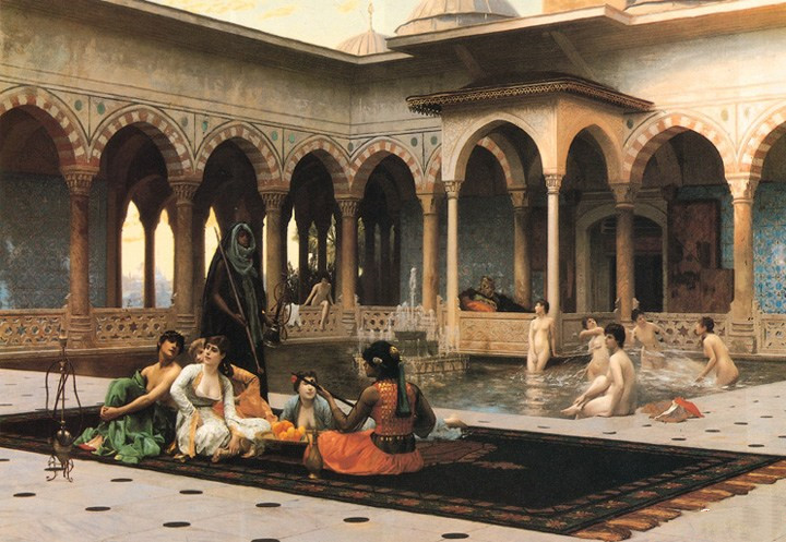 21、后宫露台 创作者:让-莱昂·热罗姆 法国 规 格:80cm×102cm 材 料:布 油彩 存藏处:私人藏 画家热罗姆是浪漫派画家德拉罗什的学生,却又极善安格尔严谨的线条。1856年,他曾赴埃及与近东旅行,收集和纪录了大量关于近东的风土人情,创作了一批极富东方情调的作品,轰动了整个法国画坛。热罗姆画的这幅《后宫露台》,描绘了阿拉伯王宫最隐秘的后宫生活,描绘了生活于后宫的王妃、宫女等女眷的闺阁生活,有的在洗浴,有的在清谈,有的在沉思……,几乎都流露出一种惆怅与茫然的神情,华丽的露台,冰冷得象囚室,不见天日,只有露台外面才是晴朗的天空与清新的气息。从构图和色彩处理上,都遗留着古典主义原则的严谨性,注重细节的和谐对比,人物、服饰、建筑尤重质感的表现,充满异国情调。