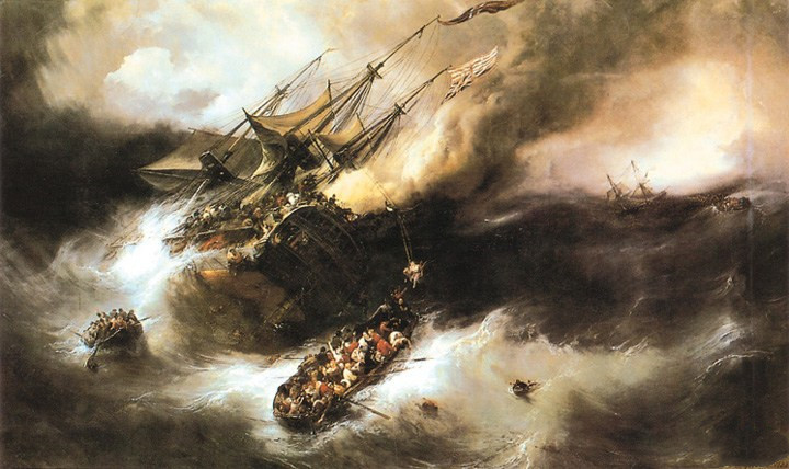 22、肯特海滩 1827年 泰奥多尔·居丹 法国 264cm×420cm 布 油彩 巴黎 马里内博物馆藏 这是一个惊心动魄的场面,一个怵目惊心的瞬间:《肯特的海滩》描绘的是在狂风暴雨的海浪中即将倾复的帆船,人们纷纷逃离帆船,乘上救生船逃命,狂涛汹涌,人们在挣扎。在黑白两色的对比中,表达的是生命与意志的不可战胜。