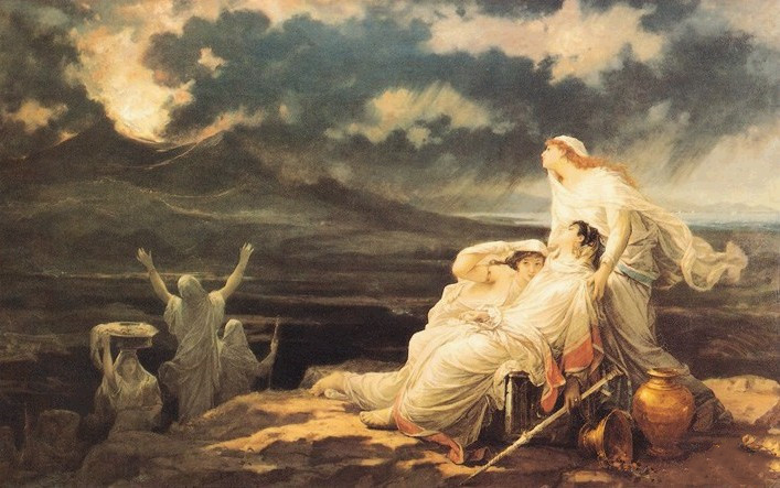31、1879年8月23日,维苏威火山爆发 1881年路易斯·埃克托尔·勒鲁 法国 190cm×303cm 布 油彩 第戎美术馆藏 画家以强烈的明暗对比手法,刻画了维苏威火山爆发瞬间人们的惊恐与绝望。远处是黑暗中爆发的火山,滚滚的尘埃遮蔽了天空和地面,更加突出了身着白衣逃难的女性。这幅作品运用古典的手法,刻画了女人们的表情与神态,体现出古典式的理性与严谨。