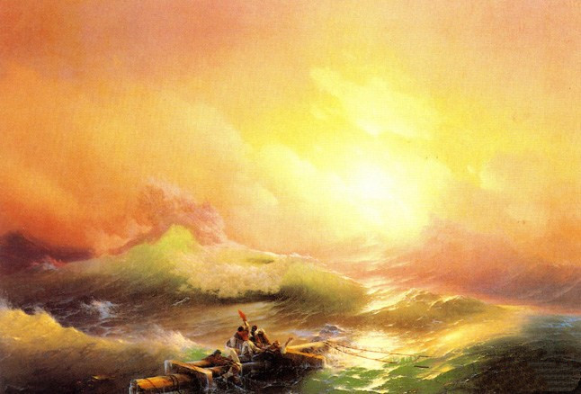 33、九级浪 1850年 I.K.艾伊瓦佐夫斯基 俄国 221cm×322cm 布 油彩 莫斯科 特列恰科夫美术馆藏 九级浪表现的是风暴中飘泊的人们,他们栖居在帆船的残余物上,为了生存,拼命挣扎,狂风巨浪,呼啸而来。暴风雨中的船与人,表现了人与大自然的抗衡,表现了自然的巨大力量与不可抗拒性。画面气势逼人,色彩动人,借以烘托人的大无畏精神。这是一幅关于人和自然的颂歌,使人震动,也使人动情,给人以难忘的印象。